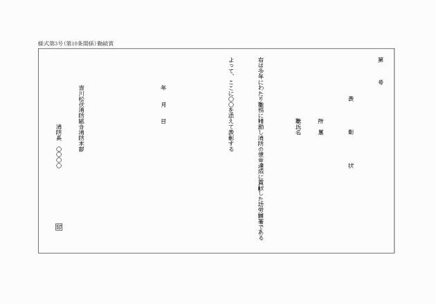 第7条 管理者表彰、消防長表彰及び感謝状には、別表第1により予算の範囲内で、副賞を授与することができる。