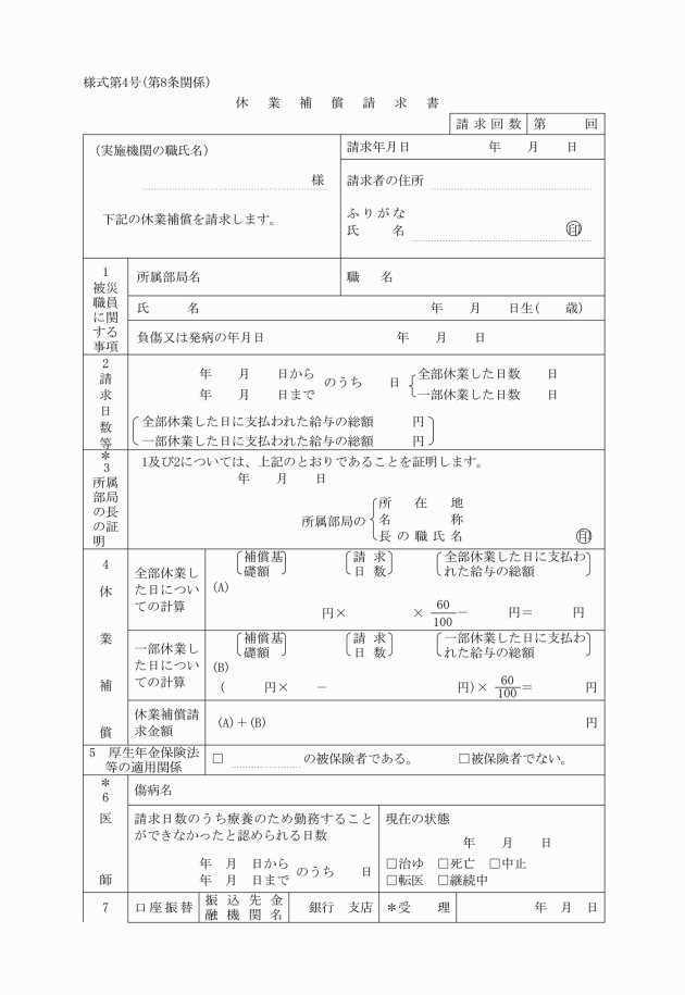 第7条 職員が公務上負傷し、若しくは疾病にかかり、又は通勤により負傷し、若しくは疾病にかかり、療養のため勤務その他の業務の全部について従事することができない場合において、職員の受ける給与その他の収入の額が補償基礎額の100分の60に相当する額に満たないときは当該満たない額に相当する額、勤務その他の業務の一部について従事することができない場合において、職員の受ける給与その他の収入の額が補償基礎額(当該療養の開始後1年6月を経過している場合において、条例第5条の3第1項の規定により市長が最高限度額として定める額(以下この条において「最高限度額」という。)を補償基礎額とすることとされている場合にあっては、同項の規定の適用がないものとした場合における補償基礎額)に満たないときは当該満たない額(当該療養の開始後1年6月を経過している場合において、当該満たない額が最高限度額を超える場合にあっては、当該最高限度額)の100分の60に相当する額を休業補償として支給する。