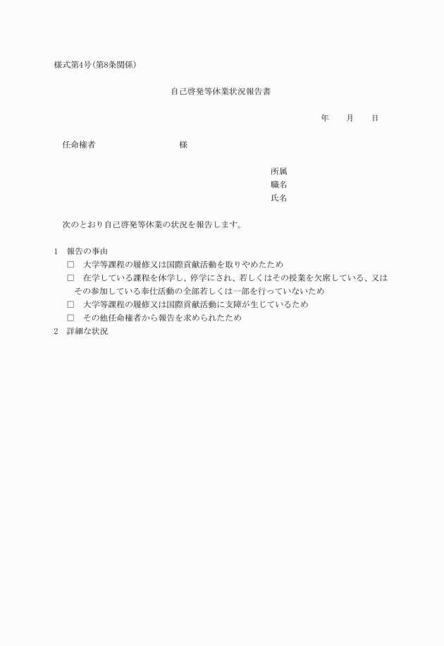 第4条 自己啓発等休業の承認を受けようとする職員は、自己啓発等休業承認申請書(様式第1号)により、自己啓発等休業を始めようとする日の3月前までに任命権者に申請しなければならない。
