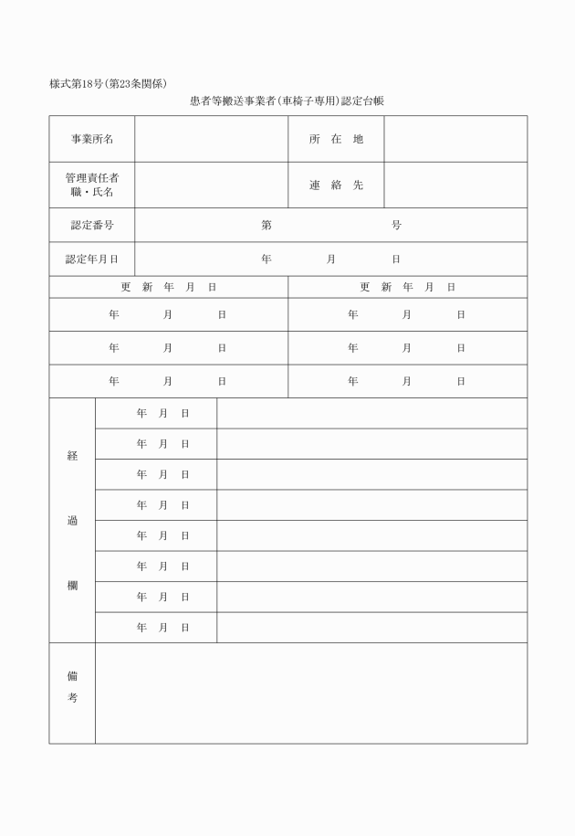 2 消防長は、患者等搬送事業内容変更届出書の記載事項を確認した後、患者等搬送事業者申請受理簿に記入するとともに、患者等搬送事業変更届出書に基づき、変更内容を確認後、患者等搬送事業者認定台帳を整理する。