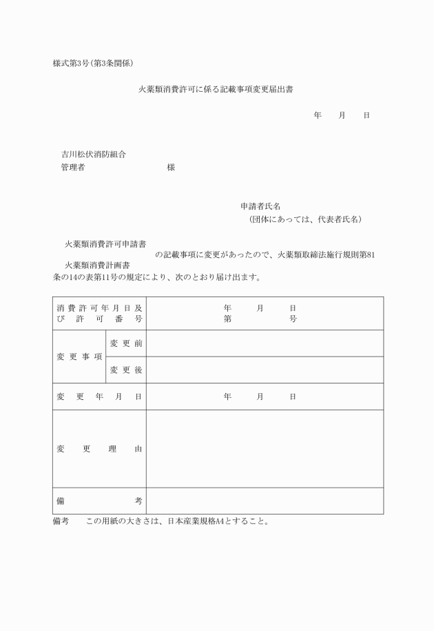 第3条 省令81条の14の表第11号の規定による許可申請書又は火薬類消費計画書の記載事項の変更の届出をしようとする者は、火薬類消費許可に係る記載事項変更届出書(様式第3号)を管理者に提出しなければならない。