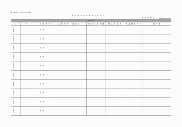 2 集団救急事故の傷病者に関する事項は、指揮本部が統括管理のうえ、集団救急事故傷病者一覧表(様式第1号)に記録する。